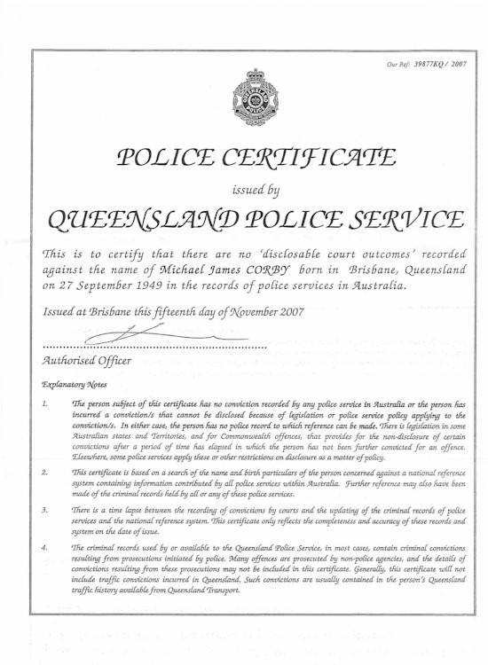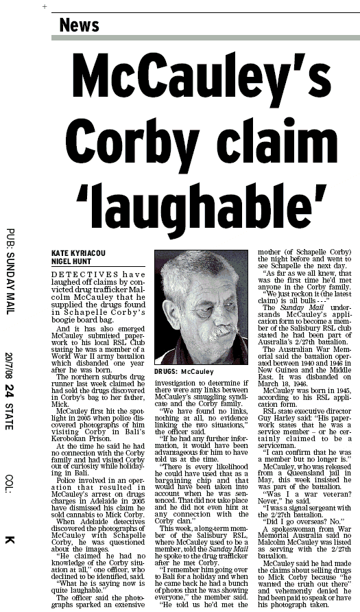 This particular smear has surfaced many times, under different guises. For example. it was tacked on to a report on Tara Hack's beautiful support song by SMH in December 2008. The idea is that Michael Corby was some sort of drugs baron. The fact that there is no evidence is hardly material in the business of smear. A known criminal and convict called Malcolm McCauley was presented as the source of this 'shocking' story.